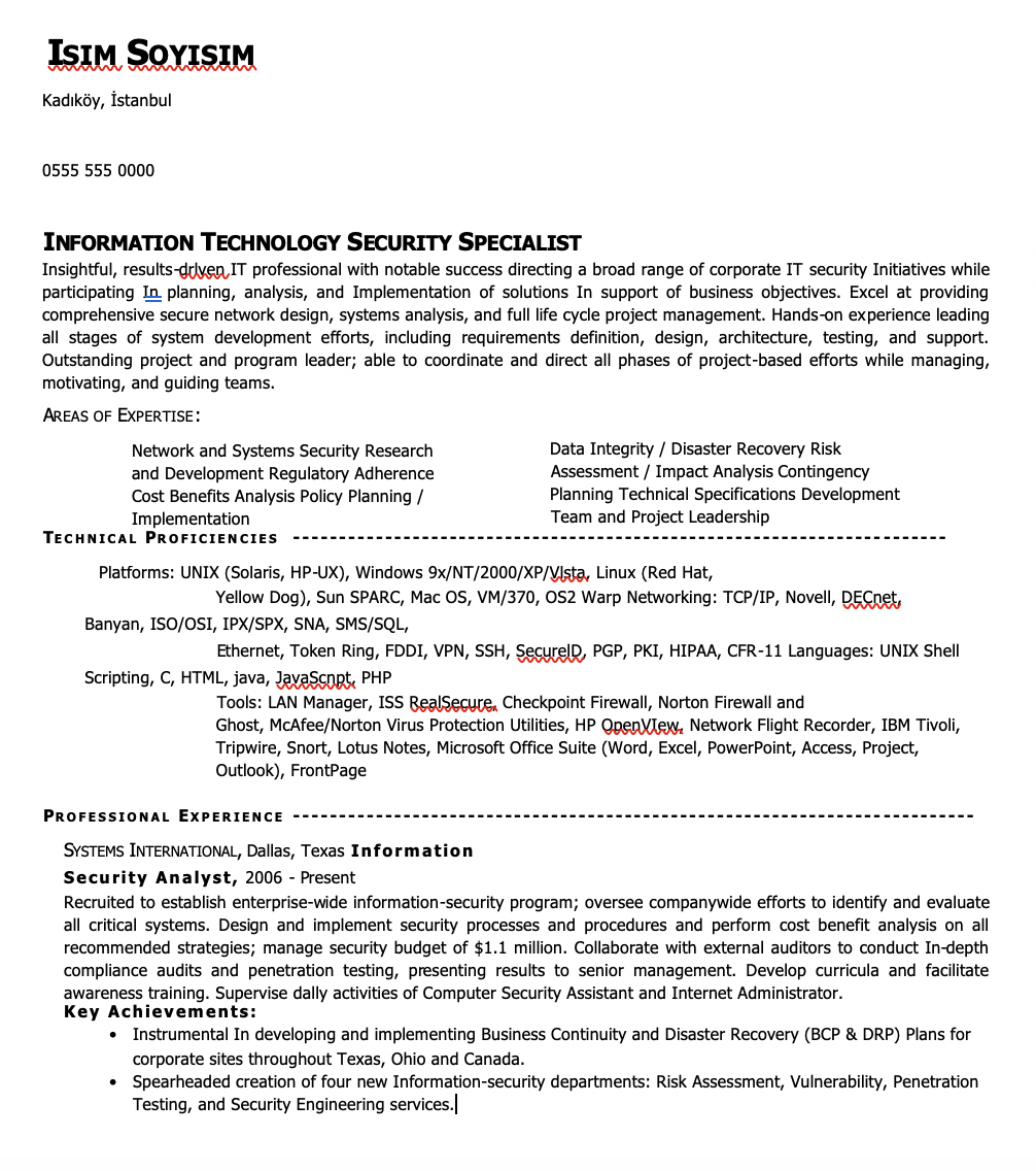 Teknik uzmanlığınızdan ve tecrübenizden bahseden bir giriş paragrafı ekleyin ve teknik yetkinlikleri tartışırken daha fazla detaya imkân veren “anahtar beceriler” başlığı altında bunları birleştirin.